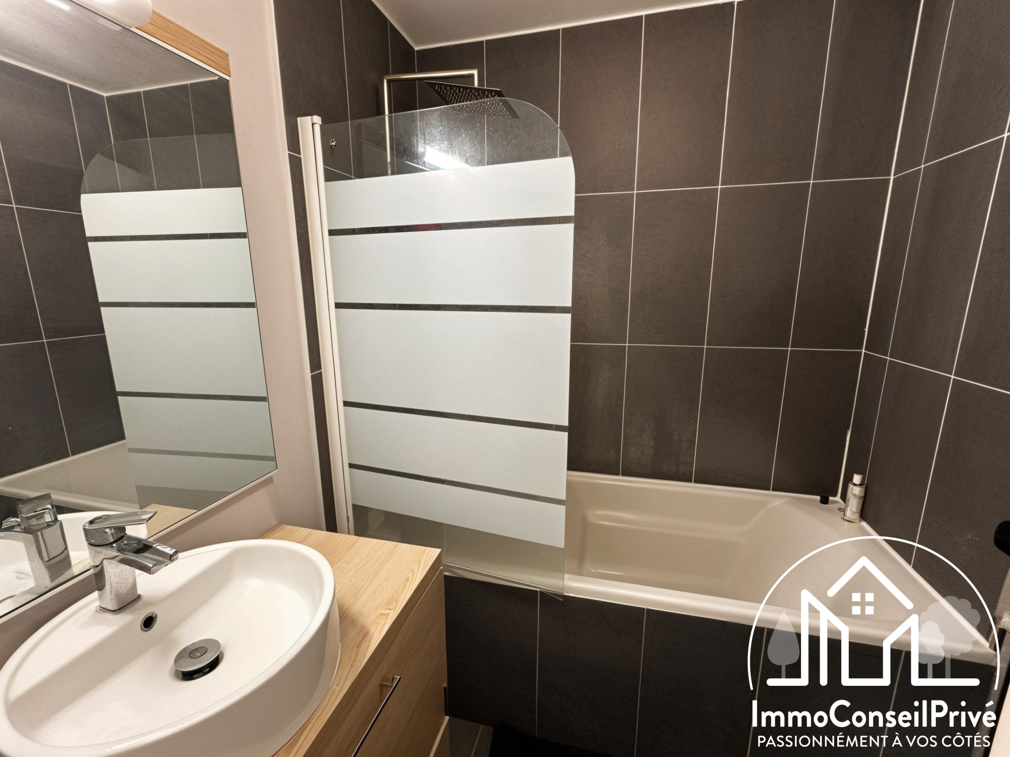 - Une salle de bain comprenant un lavabo et une douche