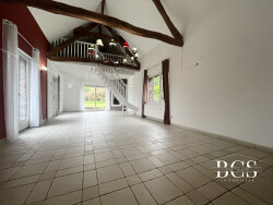 Au rdc : Hall d'entrée, grande pièce cathédrale incluant le salon-salle à manger avec insert bois avec une mezzanine (espace bureau) , vaste cuisine équipée de 37 m2 avec grand espace repas, cellier-buanderie attenant, 1 chambre avec salle de bain privative, wc, cavette