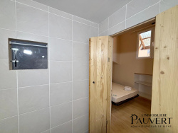 Une chambre mansardée avec rangements Une salle d'eau avec douche et WC