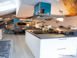 20km de PONTARLIER - FRASNE : Appartement de type 3 de caractère en duplex comprenant une entrée, une cuisine aménagée et équipée ouverte sur séjour avec accès terrasse, 2 chambres, une mezzanine, un WC, une salle d'eau, un garage et deux places de parking privatives. Petite copropriété rénovée en 2018, chauffage individuel avec un poêle à granulés. Prestations de qualité, DPE en C.