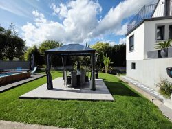 MAISON MODERNE 6 pièces 125 m² DPE B Piscine Grand jardin Gerstheim Affaire suivie par Stéphane DALCOUR 0664697003 SUPERBE MAISON CONTEMPORAINE de 125 m² (135 m² au sol) située dans un quartier calme de Gerstheim, à 5 min d'Erstein. Prestations rares : DPE B, climatisation dans chaque pièce, poêle à granulés, domotique complète et extérieur exceptionnel. Points forts : Grande pièce de vie lumineuse de 50 m² Cuisine équipée moderne Possibilité de plain-pied (bureau 14 m² + SDB complète au RDC) 4 chambres + suite parentale avec salle d'eau et terrasse privative Sous-sol complet carrelé Piscine chauffée, terrasse, cuisine d'été, terrain de pétanque Double garage motorisé + portail électrique Parcelle de 6,70 ares avec ruisseau