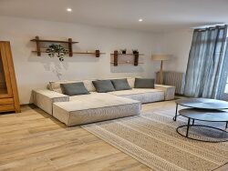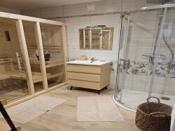 Au rez-de-chaussée : un vaste séjour moderne et très lumineux de 59 m², une cuisine indépendante entièrement équipée, une salle de bains avec douche, un espace bien-être avec sauna, WC séparés.