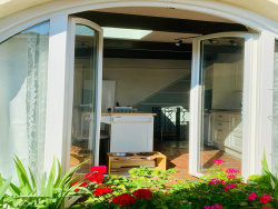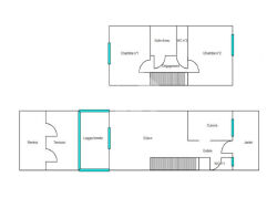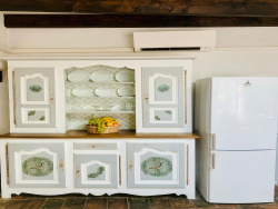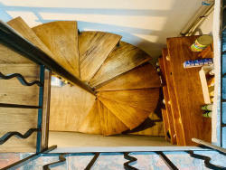 d' une ancienne écurie de 25m2 accessible de plein pied, depuis la rue où par un escalier intérieur depuis le salon. D'une hauteur de 4 m sous plafond elle dispose d'une fenêtre, de l'électricité et de l'eau. Cette écurie pouvant être aménagée après travaux en appartement ou pièces supplémentaires. au 1er niveau: une terrasse fleurie extérieure de 16m2; une cuisine américaine équipée ouverte sur le salon-salle à manger avec cheminée (insert) de 35m2; une chambre parentale avec WC et un lavabo - 9m2; au 2ème niveau: une salle d'eau/WC avec fenêtre, 2 chambres dont une avec accès par escalier intérieur menant à un toit-terrasse de 18m2, offrant une magnifique vue panoramique sur la mer, les montagnes et le village;