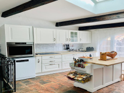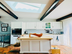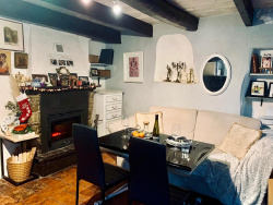 d' une ancienne écurie de 25m2 accessible de plein pied, depuis la rue où par un escalier intérieur depuis le salon. D'une hauteur de 4 m sous plafond elle dispose d'une fenêtre, de l'électricité et de l'eau. Cette écurie pouvant être aménagée après travaux en appartement ou pièces supplémentaires. au 1er niveau: une terrasse fleurie extérieure de 16m2; une cuisine américaine équipée ouverte sur le salon-salle à manger avec cheminée (insert) de 35m2; une chambre parentale avec WC et un lavabo - 9m2; au 2ème niveau: une salle d'eau/WC avec fenêtre, 2 chambres dont une avec accès par escalier intérieur menant à un toit-terrasse de 18m2, offrant une magnifique vue panoramique sur la mer, les montagnes et le village;