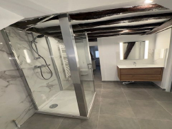 L'entrée spacieuse dessert une cuisine semi-ouverte, conviviale et fonctionnelle, une grande pièce de vie bénéficiant d'une belle hauteur sous plafond. Le charme opère immédiatement grâce à un plafond cathédrale et de magnifiques poutres apparentes, apportant authenticité et volume à l'ensemble. L'appartement comprend également une salle d'eau moderne ainsi qu'une buanderie.