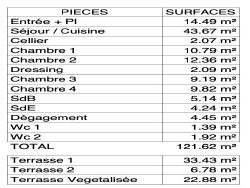 Grand T5 avec terrasses 33+6+22m2 comprenant : - Séjour 43,67m2 + cellier - Espace nuit : 4 chambres, une salle d'eau, une salle de bains, deux wcs séparés, entrée, placards, - Double parking sous sol inclus