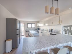 - D'un long couloir desservant 7 chambres (équipée chacune de bureau, lit 140 cm, dressing) avec leur salle d'eau et WC privatifs pour 5 chambres (1-2-5-6-7), une salle d'eau et un toilette partagés avec la chambre 3 et 4, une buanderie (deux laves linges, deux sèches linges) et un grand séjour de 40m² avec une cuisine entièrement équipée (lave vaisselle, hotte, plaque de cuisson, four, micro-onde).