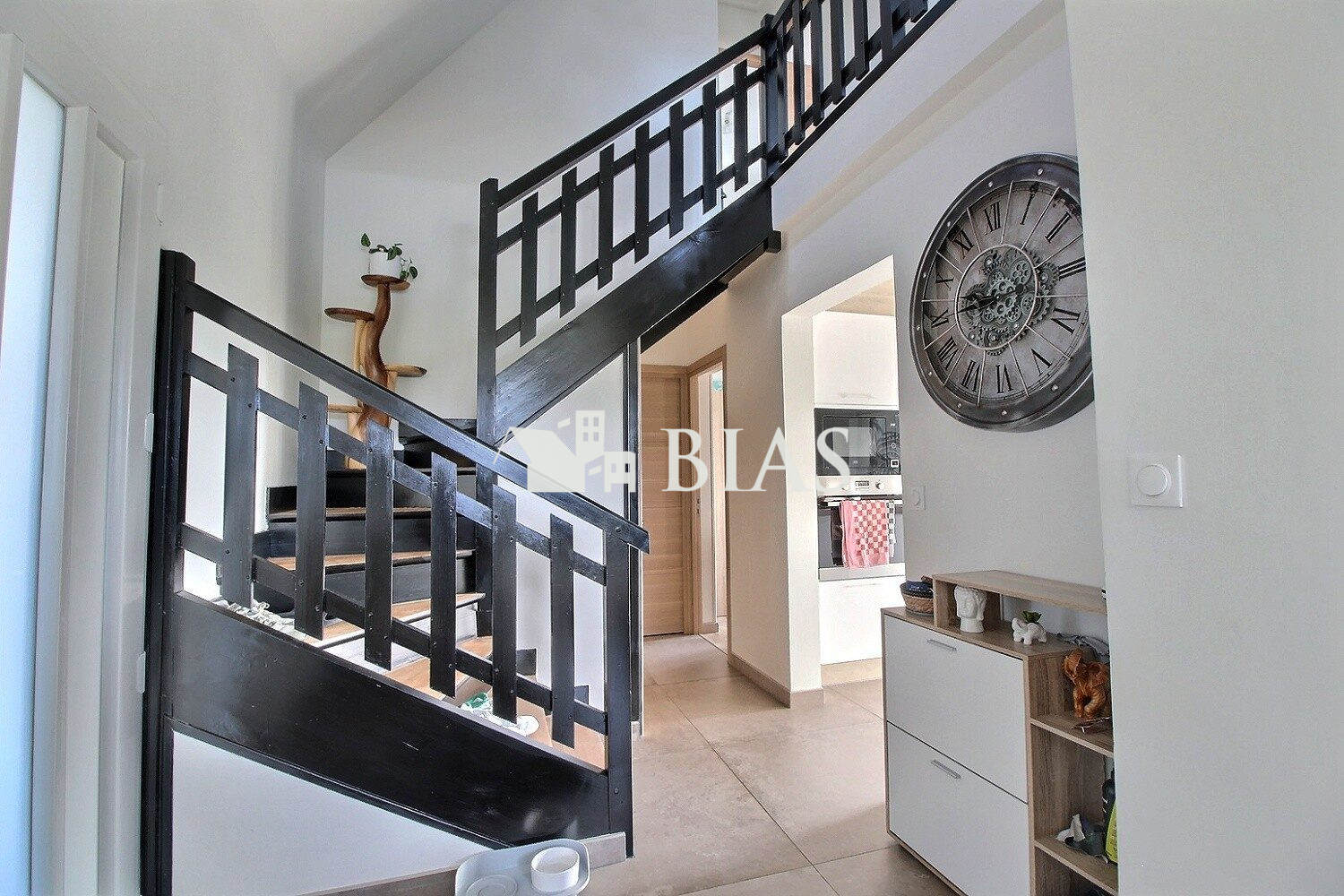 Elle se compose au rez-de-chaussée d'une entrée desservant une cuisine indépendante, un WC, un séjour/salon avec cheminée donnant accès à la terrasse et sa vue sur le jardin arboré. Un dégagement mène aux deux chambres avec placards et à la salle de bain avec WC séparés.