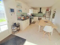 Au rez-de-chaussée, se trouve une pièce de vie spacieuse et traversante avec une cheminée, une grande cuisine qui elle aussi a accès à la terrasse, et un cellier qui donne dans cette dernière.