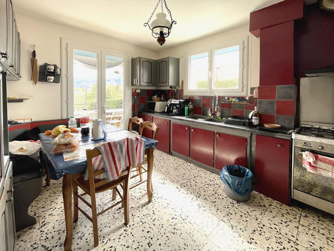 * 1er étage : grande cuisine, vaste salon lumineux, chambre avec salle de bains et WC, cellier.