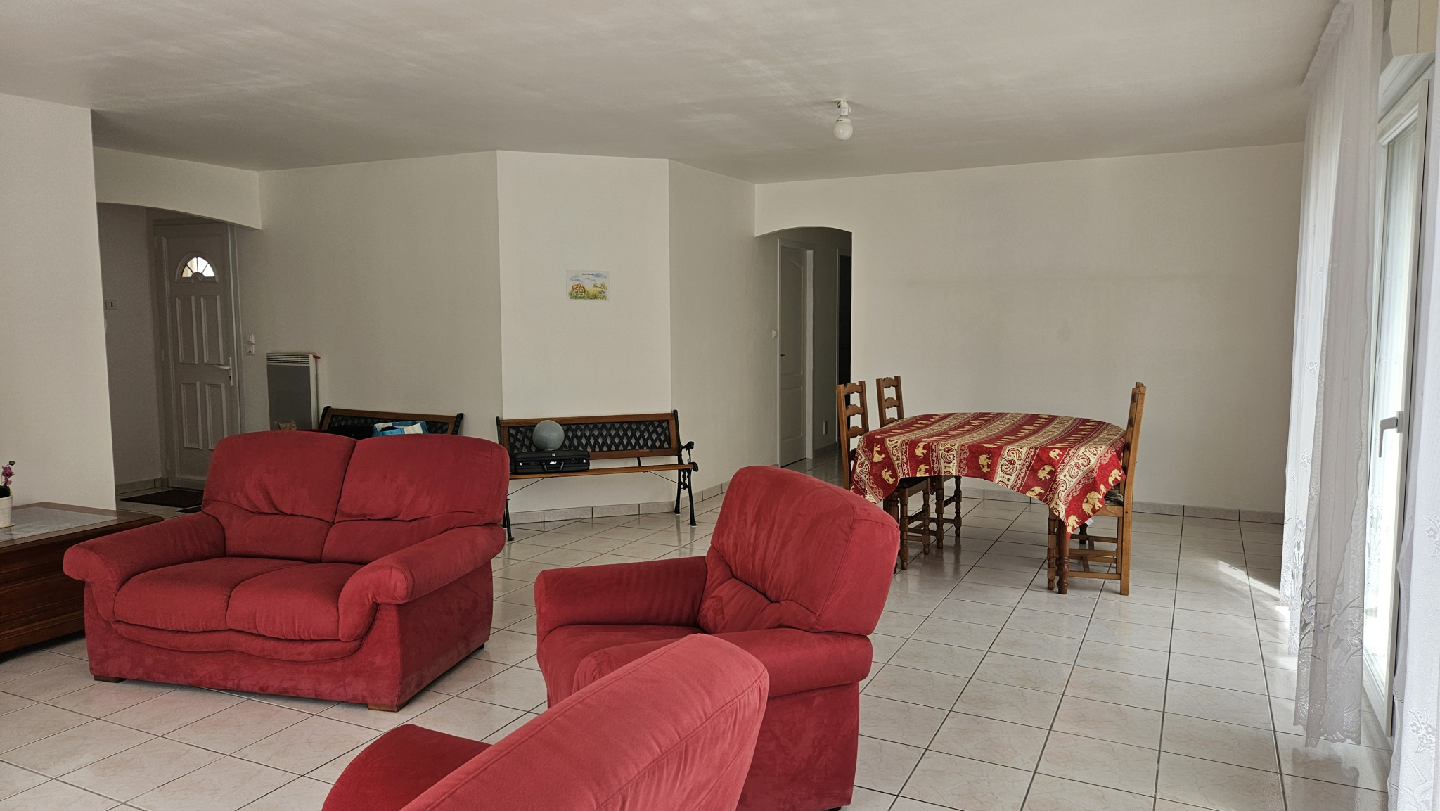 Grande pièce de vie lumineuse de 50 m2 avec cheminée à insert, pour des soirées douillettes en famille ou entre amis.