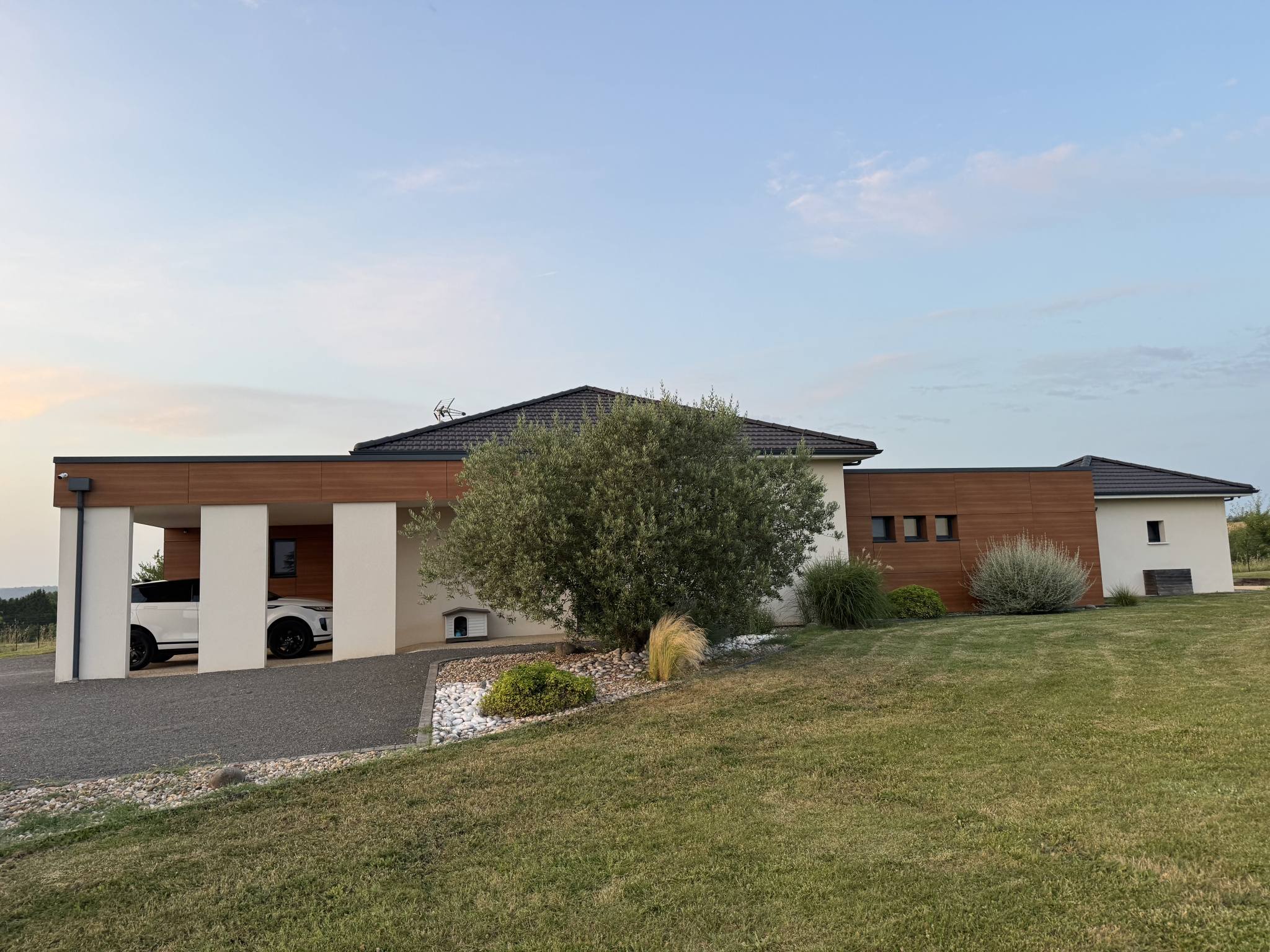 Ce qui fait la différence : - Volumes équilibrés et circulation fluide - 5 chambres au total, dont plusieurs avec sanitaires privatifs - 3 salles d'eau / salles de bain - 4 WC - Garage double de 42 m² - Menuiseries bois, belle cohérence architecturale - Performance énergétique DPE C / GES A - Chauffage bois, confort et sobriété énergétique