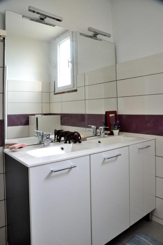 - Une salle de bain avec baignoire, meuble double vasque et WC indépendant.