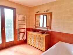 - Une salle de bain avec baignoire, meuble double vasque et WC indépendant.