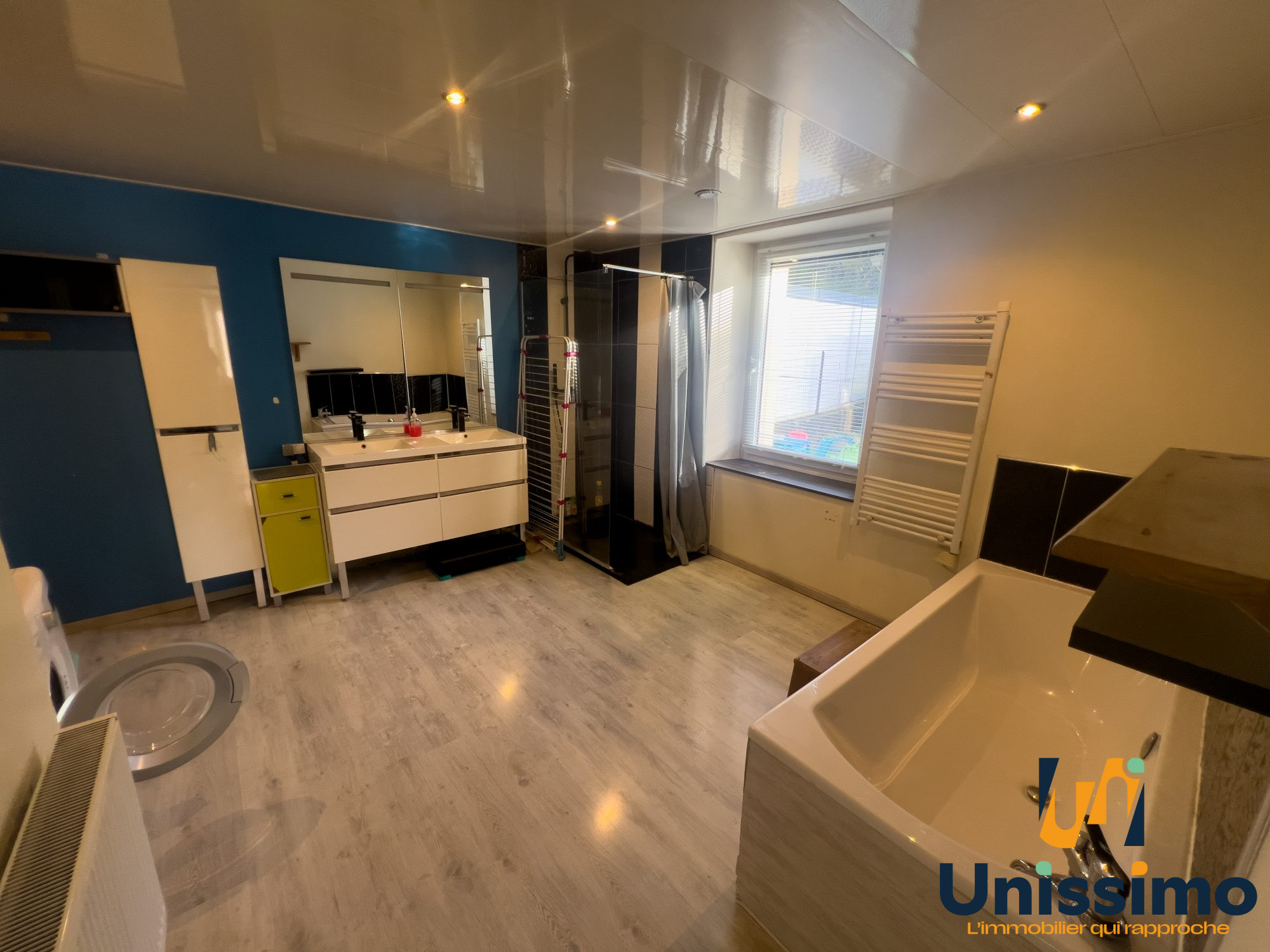 A l'étage, le palier dessert d'un côté une pièce d'eau avec douche et une première très grande chambre lumineuse et traversante (24 m²).