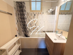 La salle de bains est dotée d'une baignoire, d'un meuble vasque et d'un sèche serviette.