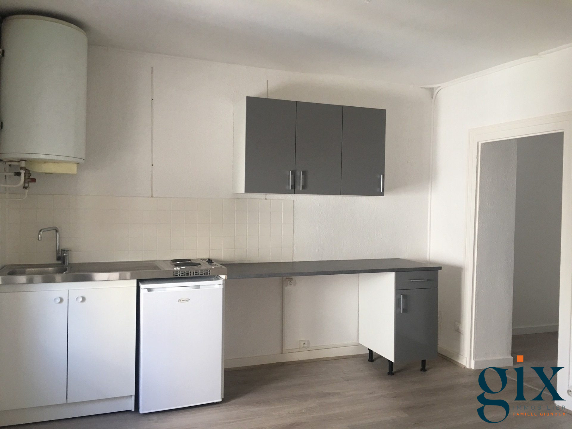 Le logement dispose d'une entrée ouverte sur une cuisine spacieuse où vous pourrez installer une table et des chaises, vous aurez également la possibilité d'installer un lave-vaisselle, la cuisine est équipée de plaque de cuisson, d'une hotte et de placards hauts et bas.