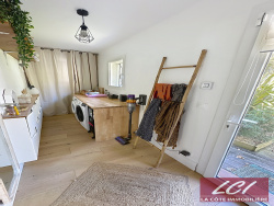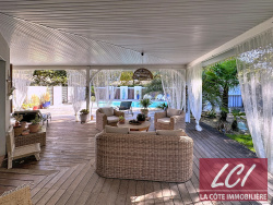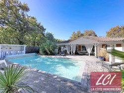 Dans un secteur agréable de Gujan, résidentiel, calme et verdoyant, à 1,5Km des commerces. Vous tomberez sous le charme de cette maison contemporaine de type louisiane en parfait état offrant de beaux espaces intérieurs et extérieurs. La maison, de 120m2 habitables de plain pied, a été construite dans les années 2000 et entièrement rénovée avec goût. Son agencement est parfaitement optimisé et convivial, et les surfaces des pièces généreuses, avec une superbe pièce principale de 56m2, 3 chambres, un dressing, une salle d'eau (possibilité d'une seconde salle d'eau), un wc, un cellier. Les ouvertures sur la terrasse couverte de 50m2 esprit varangue appellent à profiter du beau terrain de 1100m2, sans vis-à-vis, offrant des vues sur le bel environnement verdoyant et invitant à la détente, notamment autour de l'espace piscine avec sa cuisine d'été. Une grande aire de stationnement (avec prise pour charge voiture électrique), un garage et une dépendance aménagée en une superbe pièce de 20m2 environ (idéal pour recevoir ou pour une activité libérale) complètent ce très bel ensemble à découvrir.