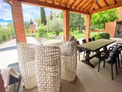 Le parc arboré d'arbres centenaires, tels que des chênes et des cèdres bleus du Liban, entoure cette maison de maître au style Toscan. Une allée serpentée vous mène à travers ce domaine exceptionnel jusqu'à un élégant porche d'entrée avec un carport pour cinq voitures connectées électrique.