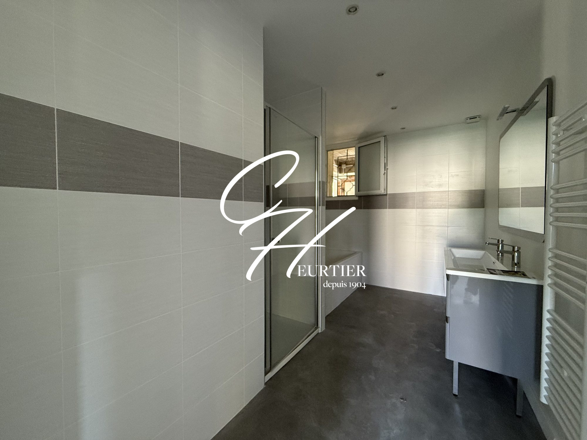 La salle de bains dispose d'une baignoire, d'une douche, d'un grand meuble de vasque, d'un miroir et d'un sèche serviette. Le WC est séparé.