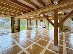 La longère se compose : Dès l'entrée, un vaste hall distribue harmonieusement les espaces. Le séjour lumineux de 70 m², exposé plein Ouest, s'ouvre largement sur la terrasse, offrant une vue imprenable sur la vallée. La cuisine dînatoire, équipée d'un îlot central, propose de nombreux rangements et se prolonge par une arrière-cuisine de 10 m², idéale pour le stockage ou comme salle à manger secondaire. Au rez-de-chaussée, une première suite avec salle d'eau et toilettes privatifs assure confort et autonomie. À l'étage, un grand dégagement mène à quatre belles chambres (14 à 44 m²), dont deux offrent une vue dominante sur la vallée. Deux chambres disposent de leur propre salle d'eau avec double vasque et toilettes, tandis qu'une troisième salle d'eau avec double vasque et toilettes complète cet étage.