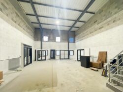 Une porte sectionnelle avec porte de service pour l'atelier. Une entrée indépendante pour les bureaux. Les 2 niveaux sont reliés par un escalier intérieur.