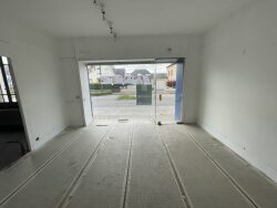 Au rez-de-chaussée : un local commercial, une cuisine, un bureau ou chambre, une grande pièce de vie (ancien laboratoire de la boulangerie), un WC, et un dégagement avec des espaces de rangement.