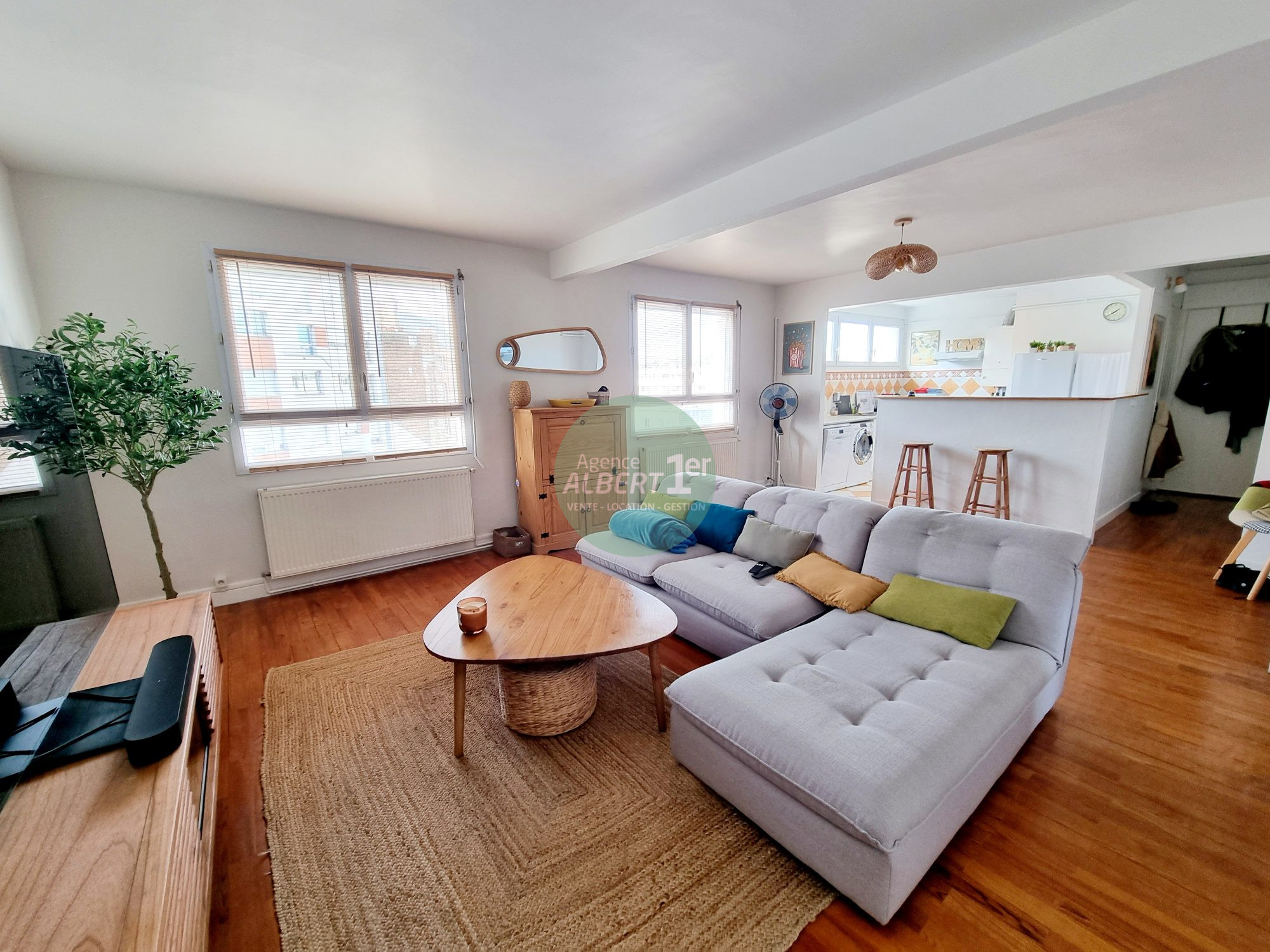 Idéal Investisseur dans rue calme secteur Rond Point Duplex type F5 entièrement meublé de 92 m² loi carrez et 107 m² au sol comprenant entrée, dégagement avec lingerie, cuisine aménagée ouverte sur séjour salon de 32 m², 4 chambres, 2 salles de bains avec wc, grenier aménagé. entrée indépendante très faibles charges vendu loué 1600 à l'année