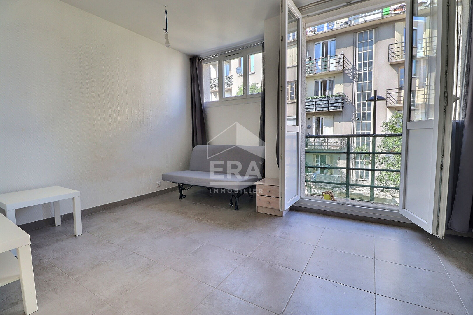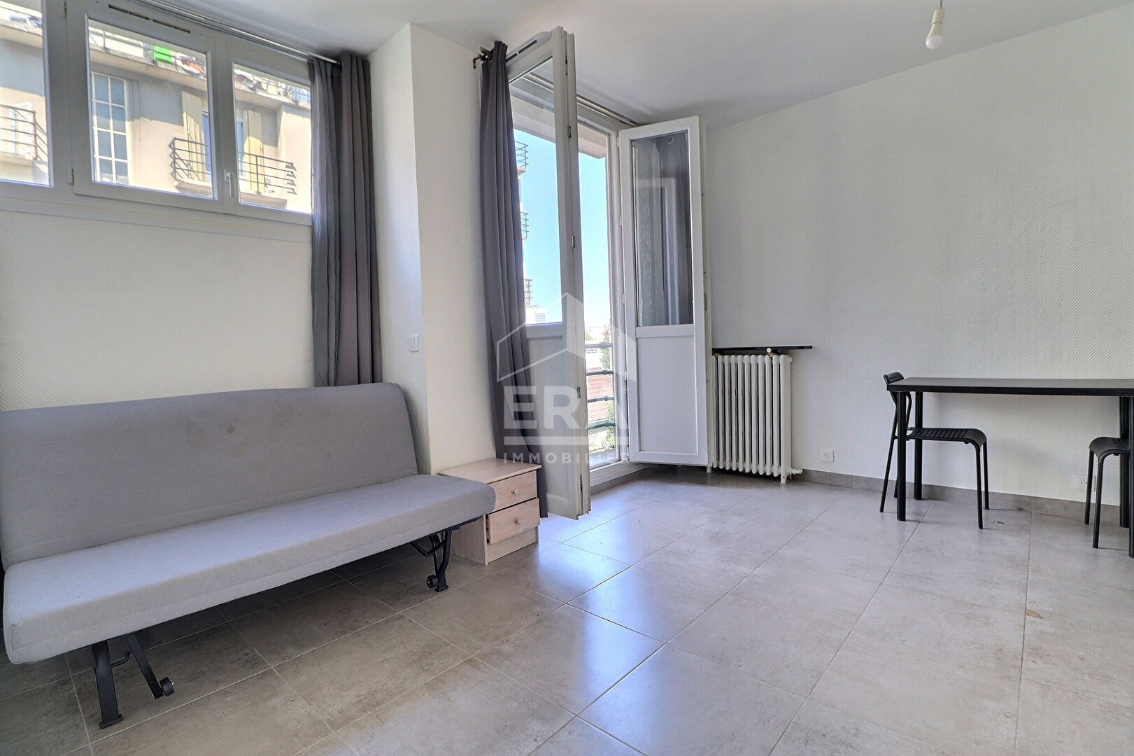 Studio meublé à proximité du métro ligne 7, il comprend une entrée avec placard, salle d'eau avec WC, pièce de vie avec canapé lit convertible, cuisine équipée aménagée, un balcon avec vue dégagée, aucun vis à vis.