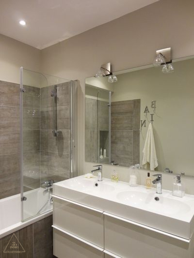 - Salle d'eau : receveur de douche, meuble vasque avec miroir et luminaire, radiateur sèche serviettes.