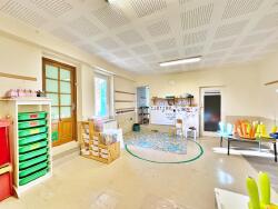 En rez-de-chaussée se trouvent deux grandes salles de classe, de 29m2 et 30,5m2, ainsi qu'un pièce cagibi de 13m2, et une salle de 6,5m2 composés de deux petits toilettes pour enfants, trois petits urinoirs et un grand lavabo.