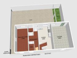 Le premier étage dispose d'une première salle qui est aujourd'hui la cantine, de 36m2 environ. La cuisine, de 16m2, puis un dégagement qui donne sur une pièce de 3m2, une salle de bains et des wc d'environ 5m2. Enfin, une seconde pièce (salle de classe) de 17m2
