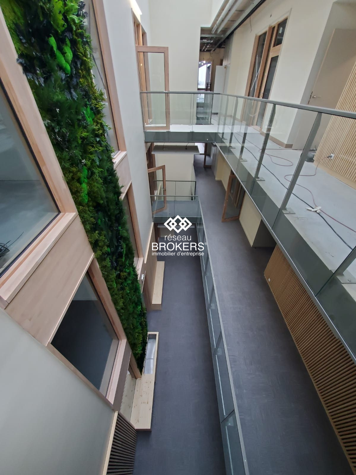 Les locaux sont livrés avec planchers techniques (moquette répondant aux exigences du BREEAM) et faux plafonds (dalles minérales 600 x 600 mm). Reste le cloisonnement à prévoir selon votre concept.