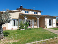 IMPOSANTE ANCIENNE PROPRIETE DE CARACTERE EN PIERRE, AVEC DOUBLE GARAGE. LE TOUT SUR UN BEAU TERRAIN ATTENANT D?UNE CONTENANCE TOTALE dénviron 3 hectares (POSSIBILITE PLUS). PRINCIPALEMENT PRAIRIES, SITUATION DOMINANTE AVEC VUE, EN CAMPAGNE AU C?UR DU QUERCY BLANC. A 2kms environ, D?UN VILLAGE TOURISTIQUE ET TOUS COMMERCES. (82150). Habitation de 275 m2 habitable aménagée sur 2 niveaux : 7 chambres, mezzanine, 1 cuisine, 1 vaste salle de séjour, salon, 2 vérandas, une salle de bains, une salle déau, 2 WC. Rez de jardin : Une entrée sur véranda de 12,9 m2, sol dallé en pierre. Un cellier, sol carrelage. Une cuisine de 17,7m2, cheminée, meuble bas, évier 2 bacs, plaque au gaz 4 feux, une fenêtre et une porte-fenêtre. Un salon de 26.6 m2, cheminée insert, sol carrelage, 2 fenêtres et une porte fenêtre ouvrant sur une vaste véranda. Une grande véranda, sol dallé en pierre. Une vaste salle de séjour de 111 m2, avec cheminée, sol carrelage, 4 fenêtres et 2 portes fenêtres ouvrant sur véranda. Une salle de bains, baignoire, douche, lavabo, WC, murs carrelage, sol moquette Etage : accès par 2 escaliers intérieur en bois dont un donnant sur mezzanine. Une mezzanine, sol plancher, une fenêtre. 3 chambres de 8,4m2 avec fenêtre, sol plancher. Une chambre de 15,8m2 avec fenêtre, sol plancher. Une salle déau, douche, lavabo, bidet, WC, sol plancher et une fenêtre. Une chambre de 20m2, avec porte-fenêtre, sol plancher. 2 chambres de 16,4m2 avec fenêtre, sol plancher. Comble : possibilité d?aménager une chambre. CHAUFFAGE CENTRAL AU FUEL ? CHEMINEE INSERT ? EN PARTIE DOUBLE VITRAGE - CHAUFFE EAU CUMULUS ? FOSSE SEPTIQUE. Dépendance séparée : Un double garage avec chaufferie. MAGNIFIQUE PROPRIETE. A VOIR. Les informations sur les risques auxquels ce bien est exposé sont disponibles sur le site Géorisques : www.georisques.gouv.fr