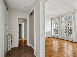A proximité immédiate du métro ' Ecole Militaire', dans le très beau quartier très recherché avec ses commercants, un magnifique immeuble en pierre de taille, très bien entretenue, au 2e étage avec ascenseur, un somptueux appartement de réception de 5 pièces 124.38m2 Carrez avec moulures, nombreuses cheminées, parquet Pointe de Hongrie et très grande cave. Il se compose d'un élégant hall d'entrée entièrement marbré, plan en étoile desservant harmonieusement l'ensemble des pièces de l'appartement agrémenté de nombreux rangements ainsi que d'une double porte blindée. Un sublime double séjour de 38 m2 avec 4 portes-fenêtres, baigné de lumière et bénéficiant d'une remarquable hauteur sous plafond de 3.30 m, sublimé par de délicates moulures, un parquet en pointe de Hongrie et de superbes cheminées Prussienne et traditionnelles. Le séjour offre un vaste et sublime espace de vie, idéal pour recevoir et partager des moments privilégiés, tout en profitant d'une vue dégagée sur la magnifique rue, la flèche des Invalides ainsi que le sommet de la Tour Eiffel. L'espace nuit se compose de trois belles chambres aux volumes généreux (15 m2 / 14 m2 / 14 m2), dont l'une dispose d'un dressing. Plusieurs dégagements avec rangements viennent compléter ces espaces. Deux salles d'eau, équipées de WC, baignoire et bidet, offrent confort et fonctionnalité. Une grande cuisine indépendante avec entrée de service vient parfaire cet appartement de caractère. Parking en option à proximité. Bien d'exception au charme Parisien rare, alliant élégance de l'ancien et prestations de qualité dans l'un des quartiers les plus recherchés de la capitale.
