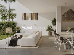 JARDIN VUE MER - 83110, Sanary-sur-Mer, La Morvenède. Argent Group Immo vend un appartement de 125 m2 avec terrasse de 30 m2, jardin de 340 m2 et garage double en sous-sol. Rez-de-jardin, vue mer depuis le jardin, calme, lumière, réception de 50 m2 avec cuisine ouverte, une master de 26 m2 avec salle d'eau et placard, deux chambres, une deuxième salle d'eau, placards, buanderie, cellier et deux wc. Prestations haut de gamme aux dernières normes (carrelage 120x120, menuiseries alu coulissantes, volets roulants motorisés, chauffage et rafraichissement individuel par PAC et gainable, placards et dressing aménagés, porte garage motorisée...), résidence intimiste et sécurisée. Confort et élégance assurés. Prix : 1260000 euros (garage inclus)