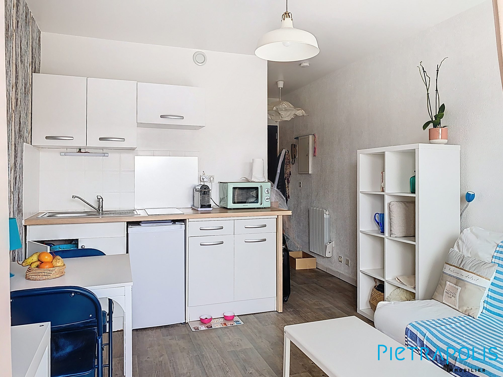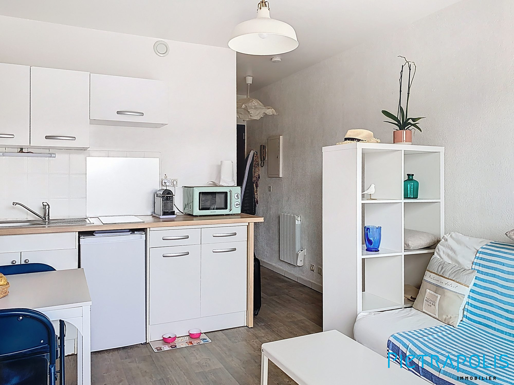 Vente aux Quilles Studio à Sète. Composé: D'une kitchenette équipée salon, cabine et terrasse. Vendu meublé avec parking privé. Exposé plein sud dans immeuble sécurisé.
