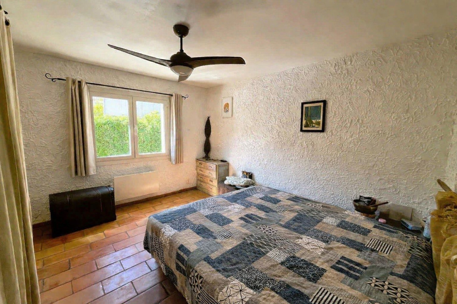 À l'étage, une chambre lumineuse avec sa terrasse privative offre un espace intime et apaisant.