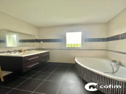 Sur la commune de Theze, Très jolie villa T4 entièrement meublée avec goût 103m², mitoyenne par le garage: composée d'une entrée avec placard, d'une cuisine moderne entièrement équipée, d'un séjour lumineux avec terrasse, de 3 grandes chambres avec dressing, d'une salle de bains (baignoire + douche + 2 vasques), d'un cellier-buanderie, d'un garage, d'une cave. Vous profiterez d'un terrain de 850m² clôturé, arboré.