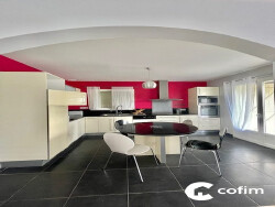 Sur la commune de Theze, Très jolie villa T4 entièrement meublée avec goût 103m², mitoyenne par le garage: composée d'une entrée avec placard, d'une cuisine moderne entièrement équipée, d'un séjour lumineux avec terrasse, de 3 grandes chambres avec dressing, d'une salle de bains (baignoire + douche + 2 vasques), d'un cellier-buanderie, d'un garage, d'une cave. Vous profiterez d'un terrain de 850m² clôturé, arboré.