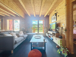 À l'étage, deux chambres spacieuses et baignées de lumière s'ouvrent sur une terrasse offrant une vue imprenable sur la nature environnante. Vous y trouverez également une salle de bain au charme cocooning, ainsi qu'un espace dédié pouvant faire office de salle de sport.