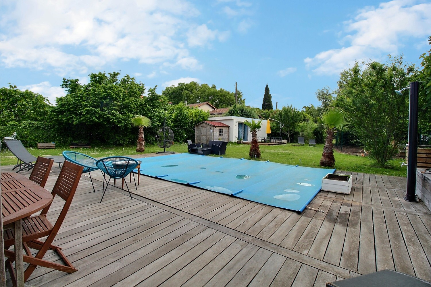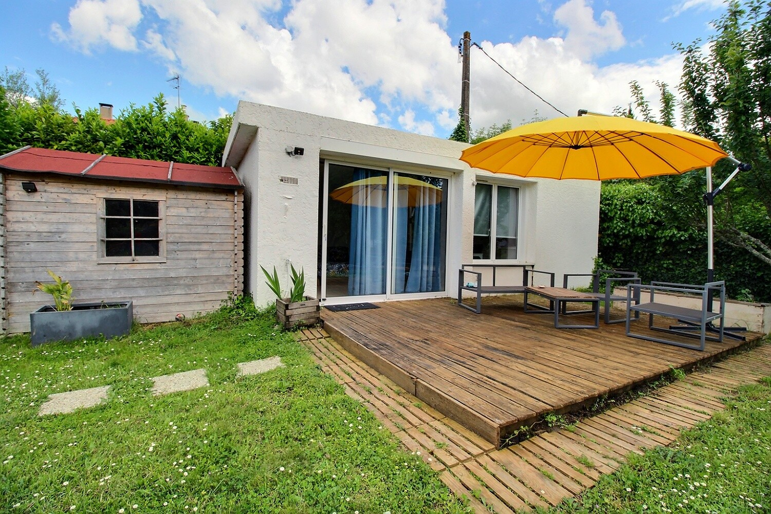 A l'étage, un espace bureau ouvert accueille en mezzanine un coin nuit d'appoint. Trois chambres, dont une avec mezzanine, se partagent une salle d'eau et une salle de bain. Le jardin arboré d'environ 300 m² prolonge l'ambiance chaleureuse et naturelle du lieu. Un studio indépendant de 19 m² vient parfaire l'ensemble.