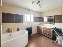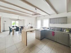 La maison est disposée comme suit : Au RDC : D'une large entrée faisant office de bureau, un grand séjour lumineux semi- ouvert sur une cuisine aménagée équipée et d'une salle à manger. Le garage a été aménagé en cellier/buanderie/garage moto. Coté nuit, 2 chambres, une salle de bain et des WC indépendants.