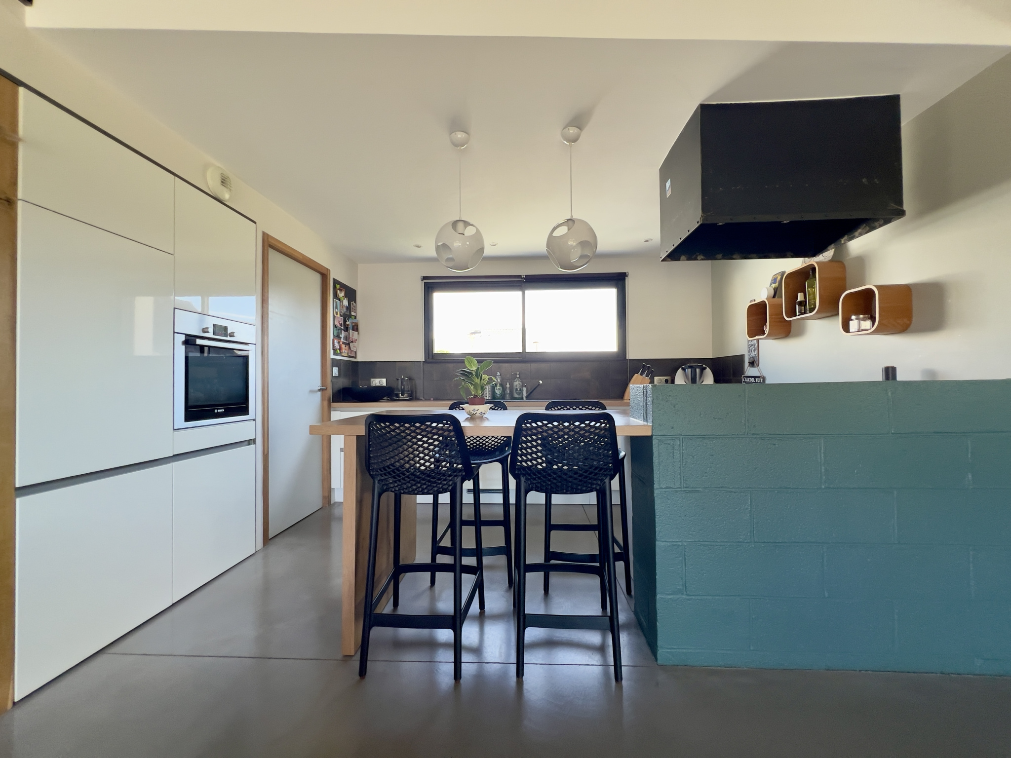 Elle comprend au rdc : Une entrée desservant une pièce de vie de 50m² avec cuisine ouverte équipée (ilôt central), une suite parentale avec dressing et salle d'eau privative, un espace bureau aménagée, une buanderie et un wc suspendu.
