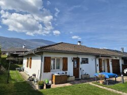 LA MOTTE SERVOLEX - MAISON T4 DE PLAIN-PIED Située dans le lotissement 'Le Nant Bruyant', cette maison jumelée par le garage côté nord offre une surface habitable de 84 m² de plain-pied. Elle se compose de : Entrée et dégagement, 2 chambres (9 et 12 m²), un bureau, salle d'eau, WC séparé, cuisine entièrement équipée ouverte sur séjour climatisé, placards. Son orientation traversante est/ouest permet de profiter d'une belle luminosité toute l'année, avec terrasses et jardin de chaque côté. Un garage de 17 m² attenant et un cellier de 7m² viennent compléter ce bien rare à la vente. Cette maison a toujours été très entretenue, vous n'aurez qu'à poser vos affaires ! Prestations : chauffage électrique par convecteurs, climatisation réversible dans le séjour, cheminée avec insert, volets bois, double vitrage PVC, adoucisseur d'eau.