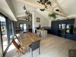 EXCLUSIVITE. La Plaine Sur Mer. Au calme à quelques minutes de la plage. Volume, luminosité et confort pour cette belle villa de 224 m2. Avec sa magnifique vue dégagée sur la campagne, elle comprend au rez-de-chaussée, une entrée avec rangements, une magnifique pièce de vie avec grande cuisine ouverte entièrement aménagée et équipée, salle à manger et un vaste salon. Cette pièce baignée de lumière offre un bien être, du charme avec ses larges baies, son plafond effet cathédrale (4 m) et ses poutres apparentes. Le tout donnant accès à de grandes terrasses et au jardin clos, arboré et sans vis à vis. Un dégagement qui dessert un espace nuit (pouvant être rendu indépendant pour de la location) comprenant un bureau, deux chambres avec dressings, une vaste pièce d'eau avec douche, baignoire et Wc suspendu. Une buanderie et un deuxième Wc suspendu complètent ce niveau. A l'étage se trouvent une mezzanine ouverte sur l'entrée, un dégagement desservant 3 chambres, une salle d'eau avec Wc. Un grand garage complète cette jolie propriété. Belles prestations, volets électriques et alarme, vmc double flux thermodynamique avec pompe à chaleur intégré (chaud/froid), double vitrage, caméra de suveillance. Maison entierement sous domotique et pilotable à distance (volets, alarme, poêle, vmc et sèche serviette), fibre optique. Maison très économique.Belle parcelle de plus de 800 m2. A quelques minutes de la Plaine et de la plage du Cormier. Pornic en moins de 10 minutes. Bien rare sur le secteur offrant beaucoup de perspectives. A visiter sans tarder. Contactez-moi Julien Delanoë au 06.62.17.78.80 Inscrit au RSAC de Nantes sous le No 827878901 agissants sous le statut d'agent commercial pour le compte d'Immo Nantes. Réf : 2205JDIMMO : honoraires inclus à la charge de l'acquéreur : 3.76% 'Les informations sur les risques auxquels ce bien est exposé sont disponibles sur le site Géorisques : www.georisques.gouv.fr'