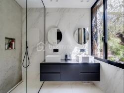Une architecture intemporelle : Édifiée en béton banché, la maison affirme un parti pris audacieux et raffiné. Plus de 30 mètres linéaires de baies vitrées prolongent chaque perspective et inondent les espaces de lumière naturelle, tandis que des brise-soleil orientables assurent un confort optimal au fil des saisons.