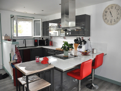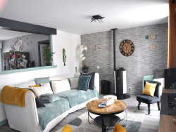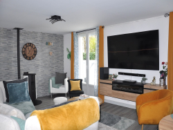 La maison comprend : Un séjour lumineux avec poêle à pellets, donnant sur une terrasse, cuisine ouverte aménagée et équipée, dégagement avec placard de rangement, trois chambres, salle de bain, WC indépendant, cellier/buanderie.