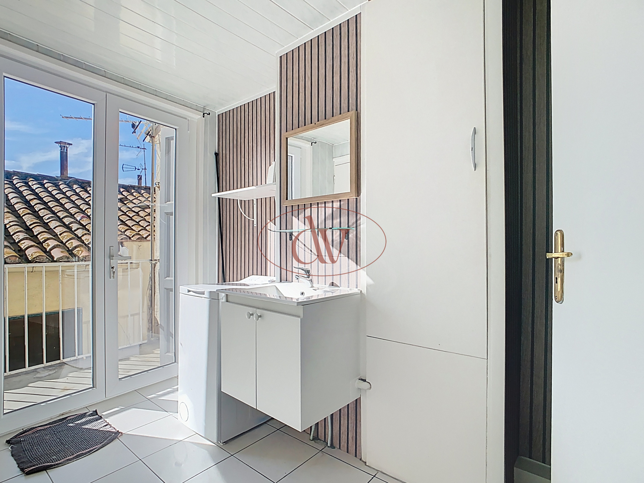 Au rez-de-chaussée : un séjour avec cuisine ouverte, une salle de bains, et une buanderie. À l'étage : 2 chambres et un espace commun avec accès à l'entrée, pouvant servir de coin bureau ou petit salon.
