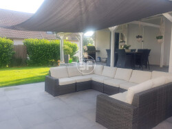 Côté extérieur, la maison dispose d'une terrasse prolongée par une grande pergola couverte d'environ 30m², d'un jacuzzi 5 places utilisable été comme hiver, ce dernier est posé sur une belle terrasse aménagée de 45m2, d'un jardin arboré.